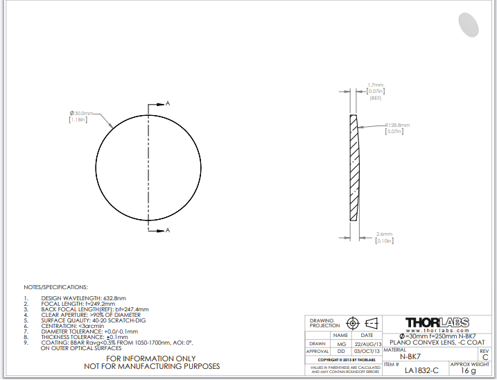 Thorlabs索雷博    LA1832-C   平凸透镜