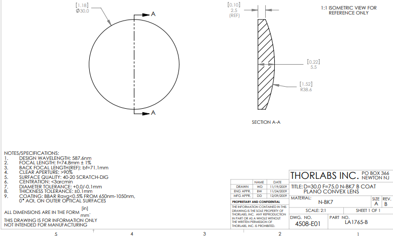 Thorlabs索雷博 LA1765-B 平凸透镜