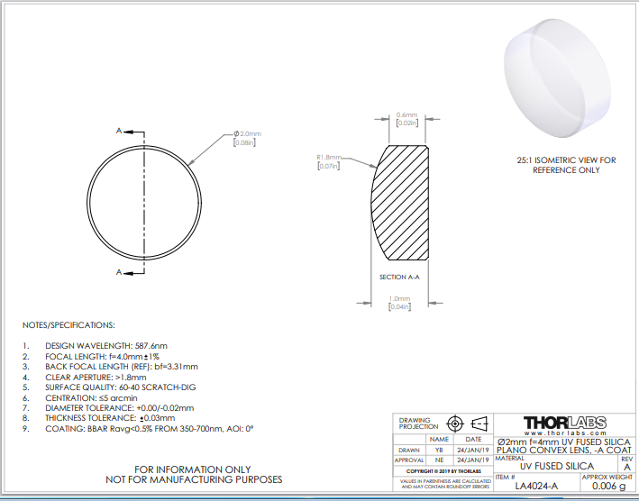 Thorlabs索雷博 LA4024-A 平凸透镜