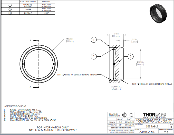 Thorlabs索雷博 LA1986-A-ML 平凸透镜