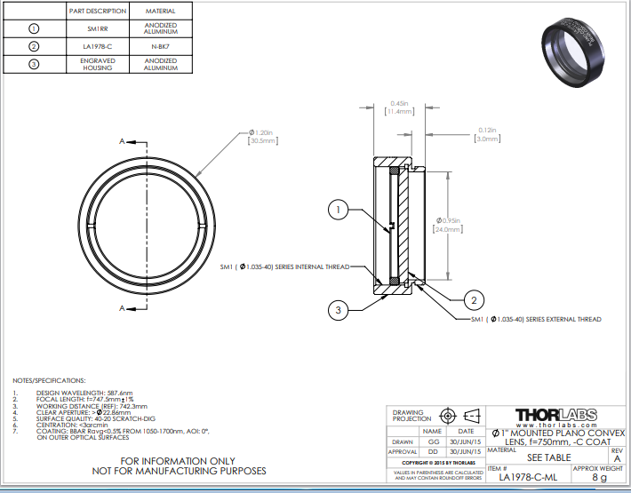 Thorlabs索雷博 LA1978-C-ML 平凸透镜