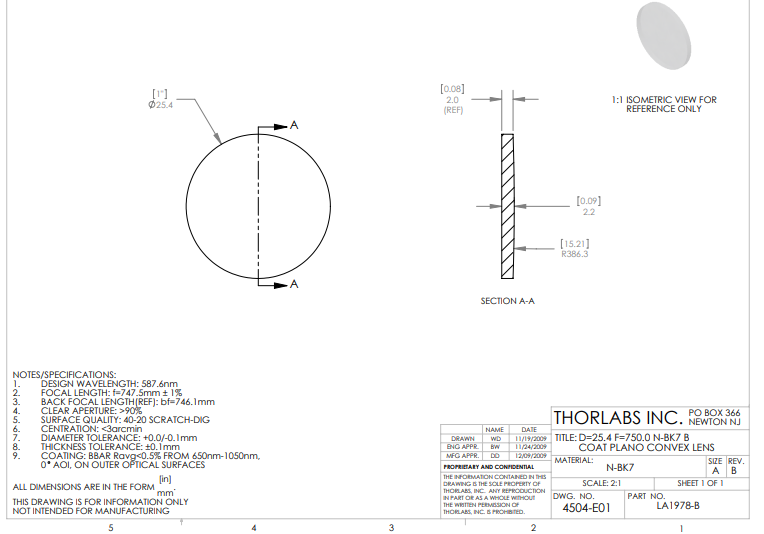 Thorlabs索雷博 LA1978-B 平凸透镜