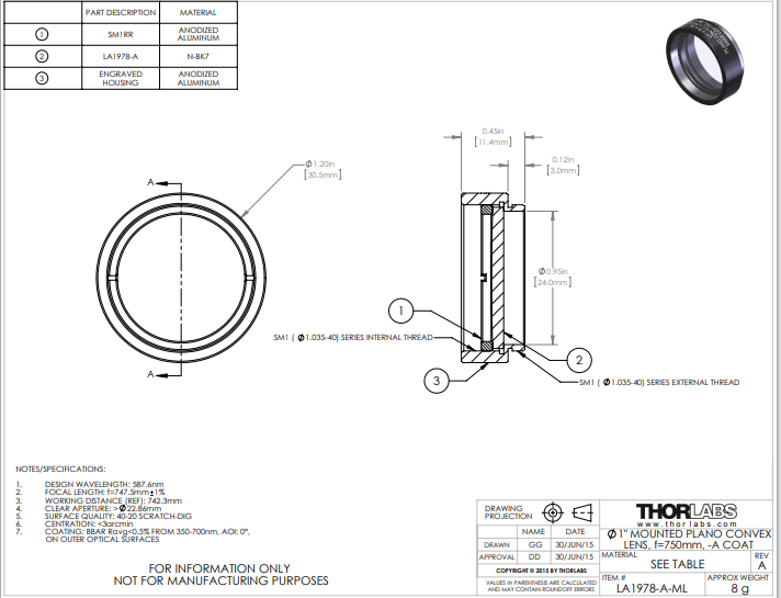 Thorlabs索雷博    LA1978-A-ML   平凸透镜