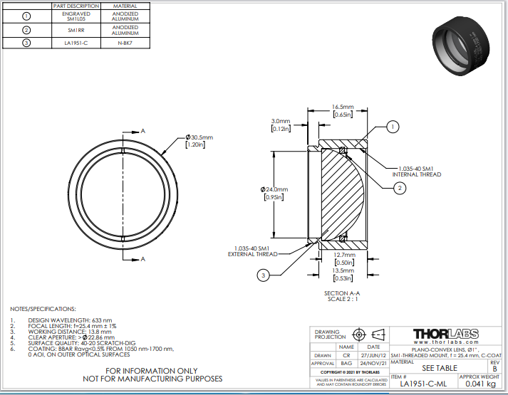Thorlabs索雷博    LA1951-C-ML   平凸透镜