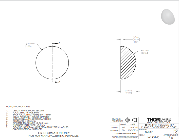 Thorlabs索雷博 LA1951-C 平凸透镜