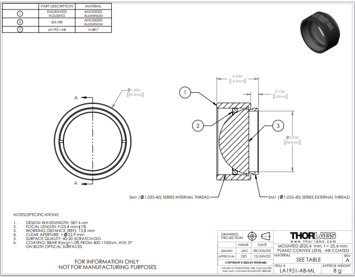 Thorlabs索雷博    LA1951-AB-ML   平凸透镜