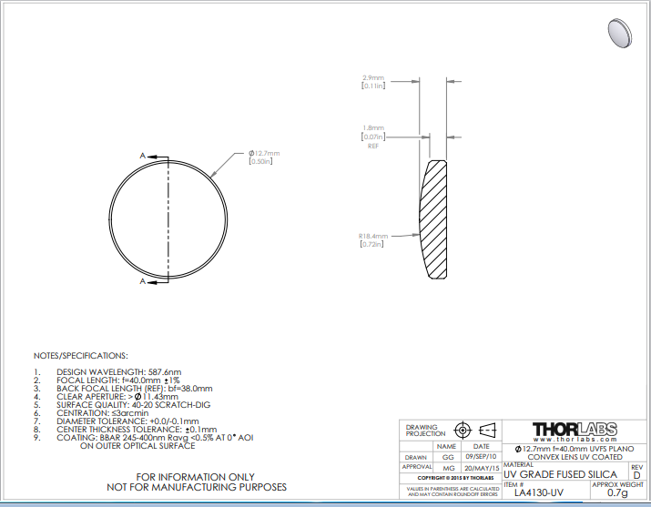Thorlabs索雷博 LA4130-UV 平凸透镜