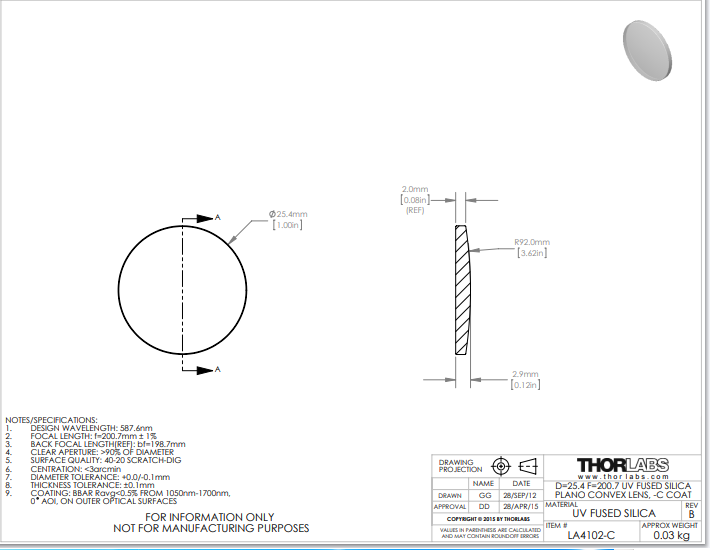 Thorlabs索雷博    LA4102-C   平凸透镜