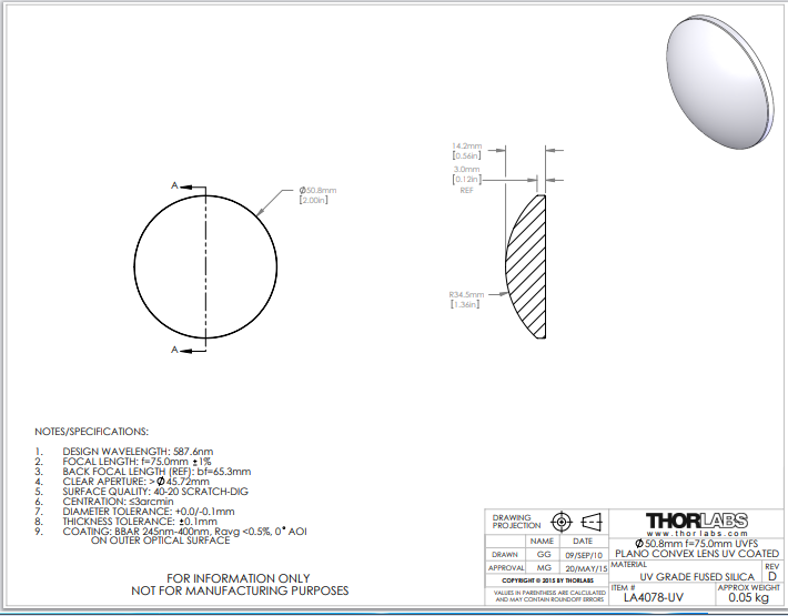 Thorlabs索雷博 LA4078-UV 平凸透镜