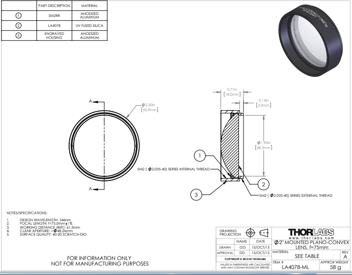 Thorlabs索雷博 LA4078-ML 平凸透镜