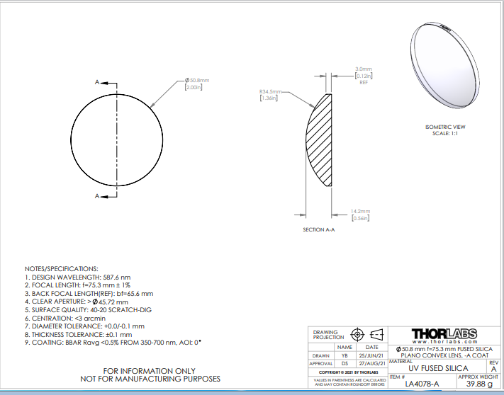 Thorlabs索雷博    LA4078-A   平凸透镜
