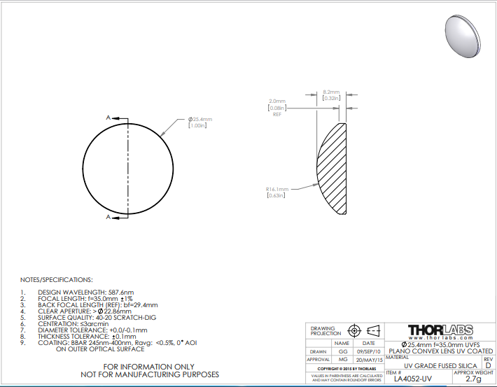 Thorlabs索雷博 LA4052-UV 平凸透镜
