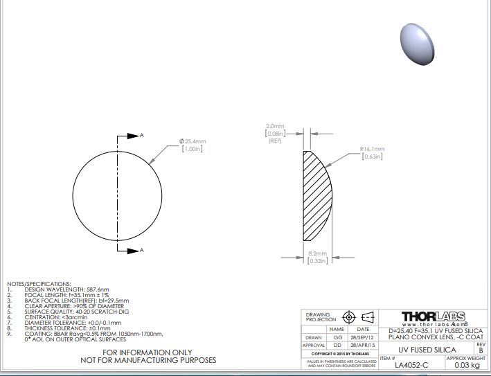 Thorlabs索雷博 LA4052-C 平凸透镜