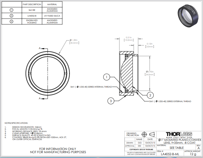 Thorlabs索雷博    LA4052-B-ML   平凸透镜