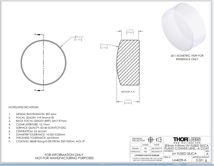 Thorlabs索雷博 LA4039-A 平凸透镜