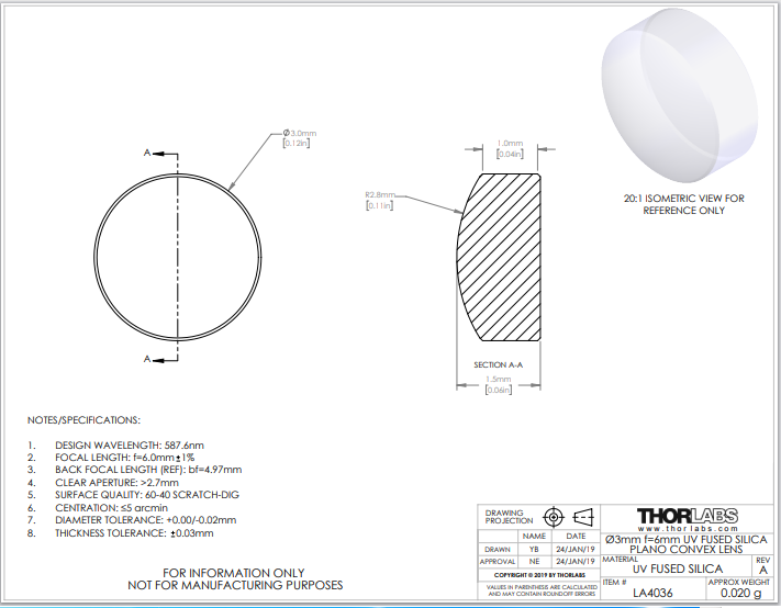 Thorlabs索雷博 LA4036 平凸透镜