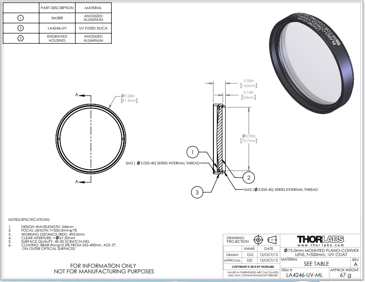 Thorlabs索雷博 LA4246-UV-ML 平凸透镜