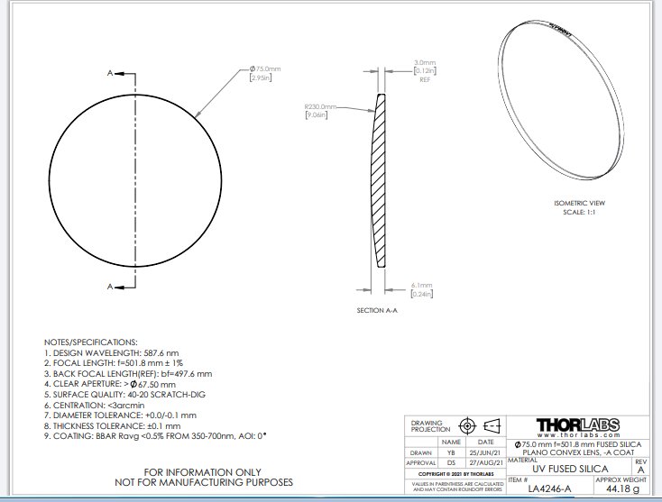 Thorlabs索雷博    LA4246-A   平凸透镜