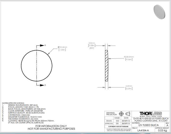 Thorlabs索雷博    LA4184-A   平凸透镜