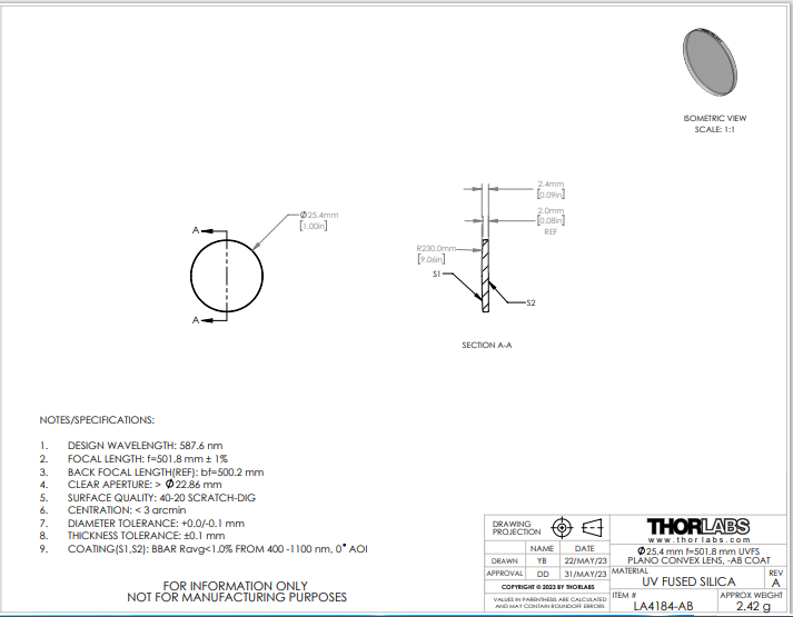 Thorlabs索雷博 LA4184-AB 平凸透镜
