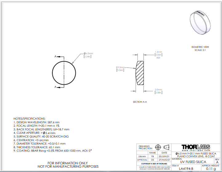 Thorlabs索雷博 LA4194-B 平凸透镜