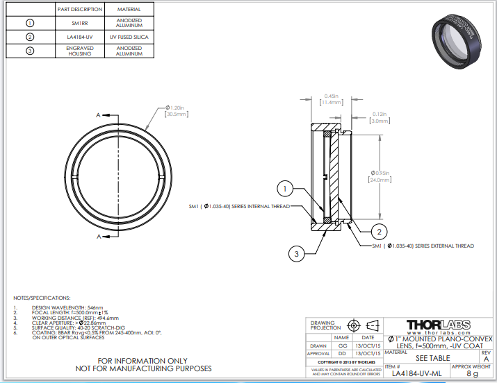 Thorlabs索雷博 LA4184-UV-ML 平凸透镜