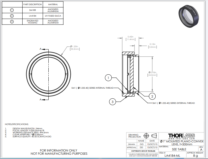 Thorlabs索雷博    LA4184-ML   平凸透镜