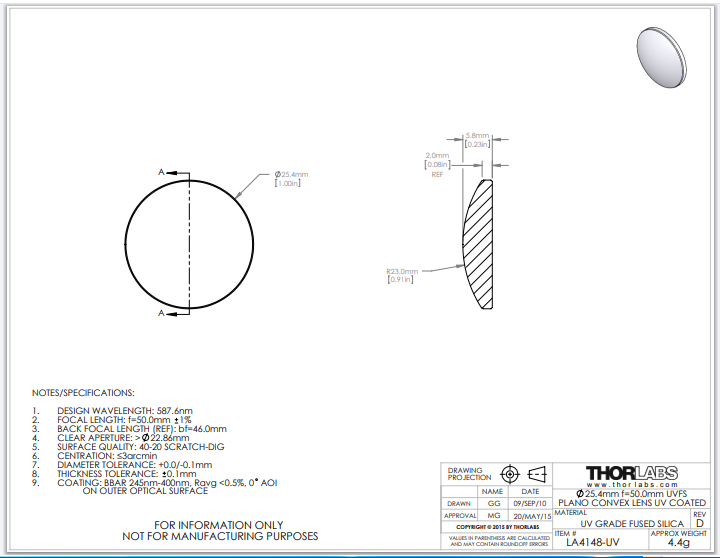 Thorlabs索雷博 LA4148-UV 平凸透镜