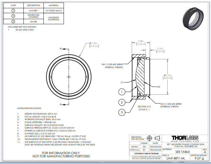 Thorlabs索雷博 LA4148T1-ML 平凸透镜
