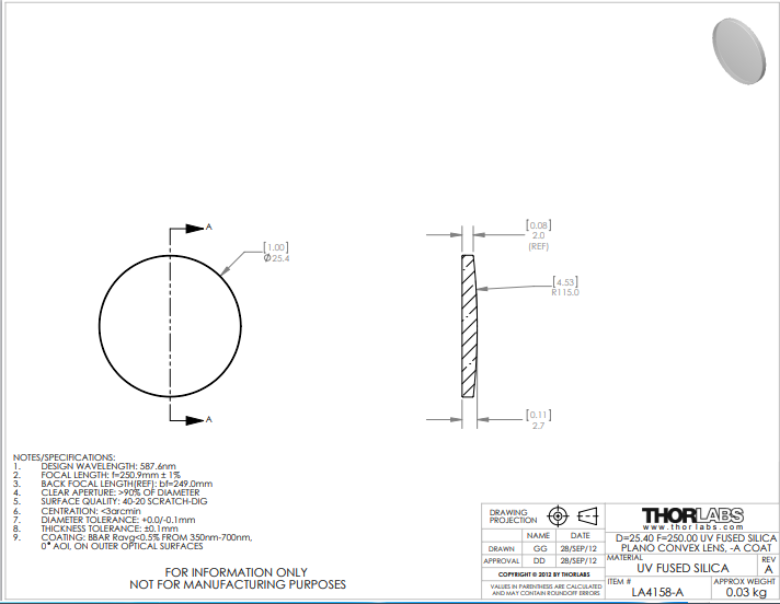 Thorlabs索雷博    LA4158-A   平凸透镜