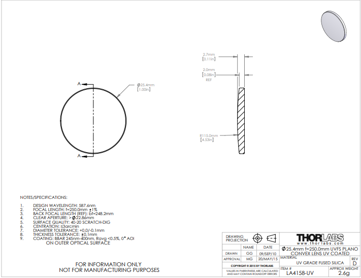 Thorlabs索雷博 LA4158-UV 平凸透镜