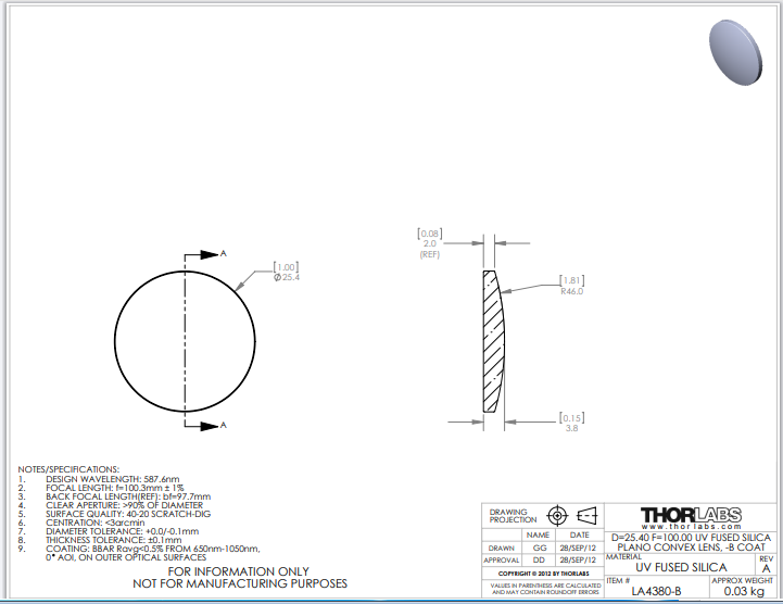 Thorlabs索雷博 LA4380-B 平凸透镜
