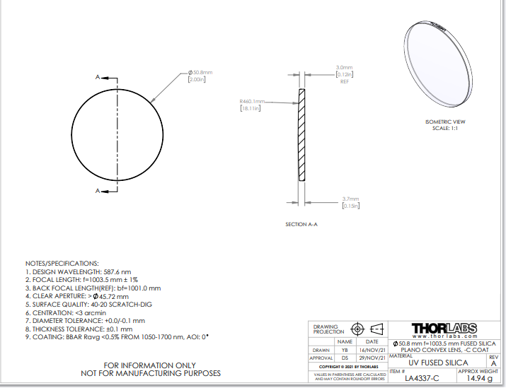 Thorlabs索雷博 LA4337-C 平凸透镜
