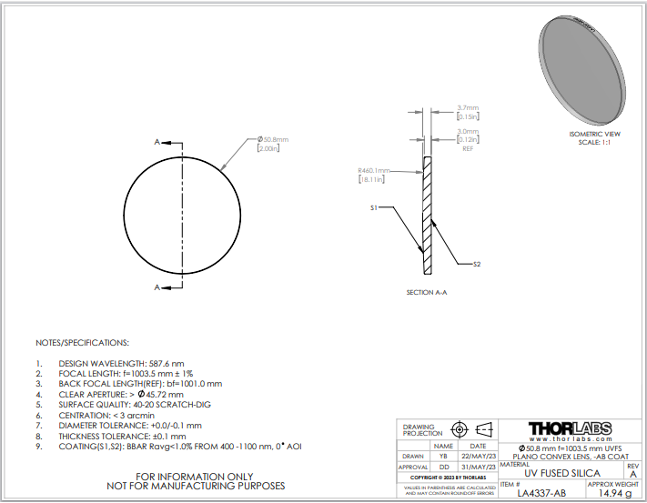 Thorlabs索雷博 LA4337-AB 平凸透镜