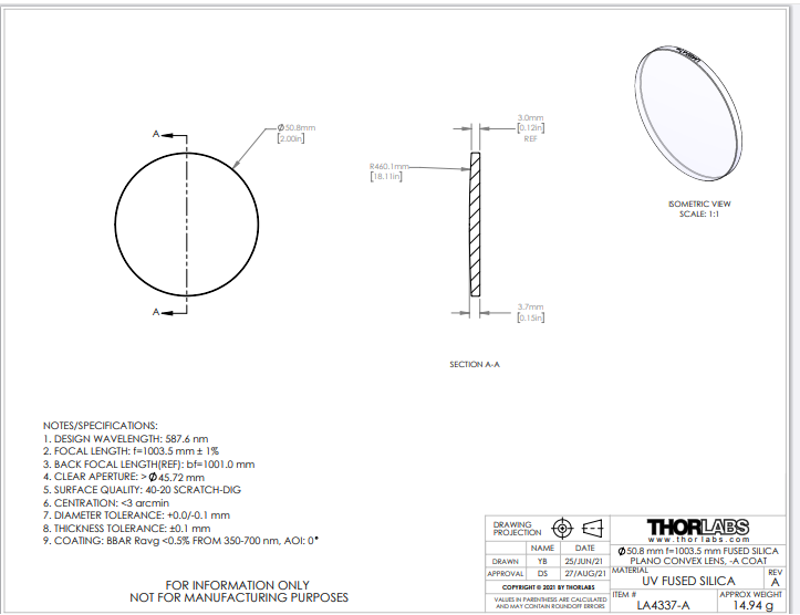 Thorlabs索雷博 LA4337-A 平凸透镜