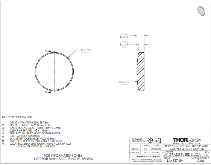 Thorlabs索雷博 LA4327-UV 平凸透镜