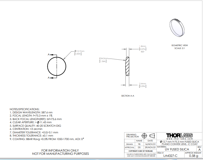 Thorlabs索雷博    LA4327-C   平凸透镜