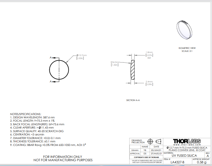 Thorlabs索雷博 LA4327-B 平凸透镜
