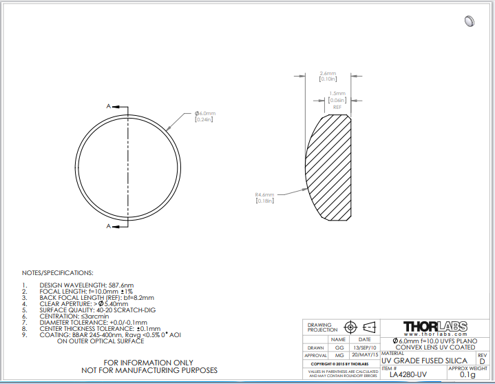 Thorlabs索雷博    LA4280-UV   平凸透镜