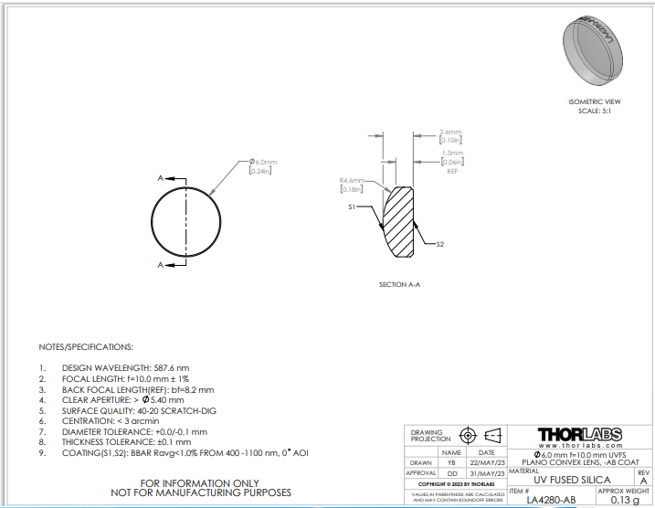 Thorlabs索雷博    LA4280-AB   平凸透镜