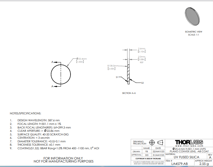 Thorlabs索雷博 LA4579-AB 平凸透镜