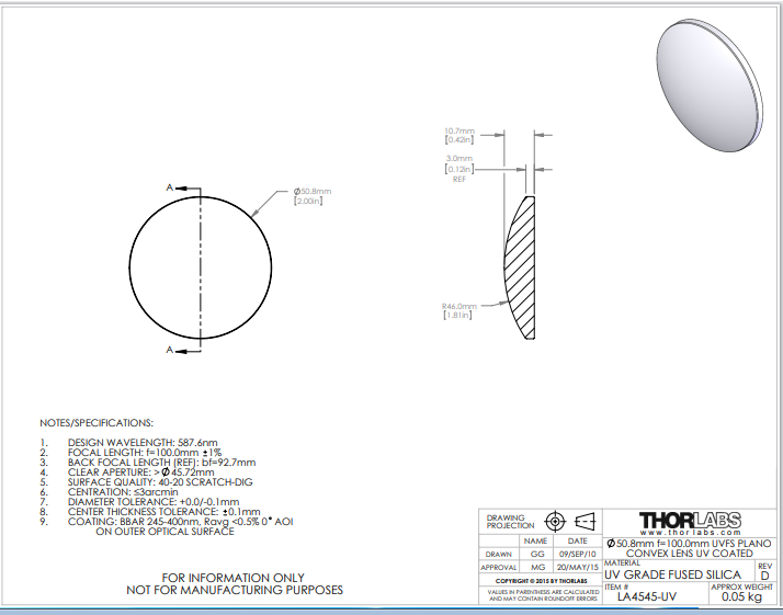 Thorlabs索雷博 LA4545-UV 平凸透镜