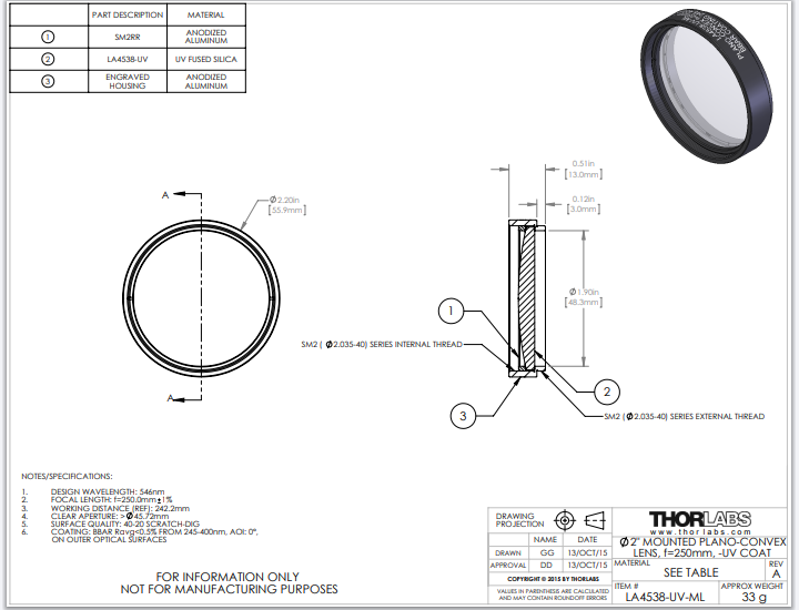 Thorlabs索雷博 LA4538-UV-ML 平凸透镜