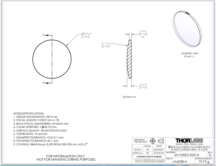 Thorlabs索雷博 LA4538-A 平凸透镜