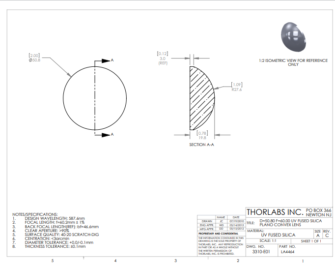 Thorlabs索雷博 LA4464 平凸透镜