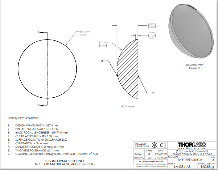 Thorlabs索雷博    LA4384-AB   平凸透镜