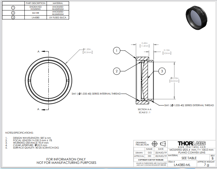 Thorlabs索雷博 LA4380-ML 平凸透镜