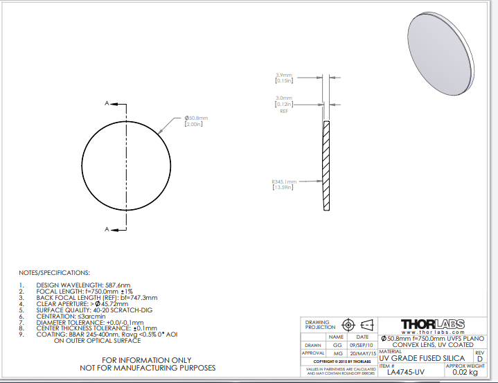Thorlabs索雷博 LA4745-UV 平凸透镜