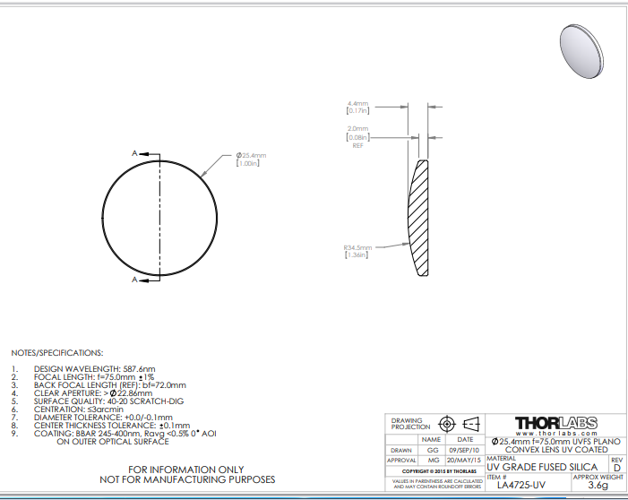 Thorlabs索雷博 LA4725-UV 平凸透镜