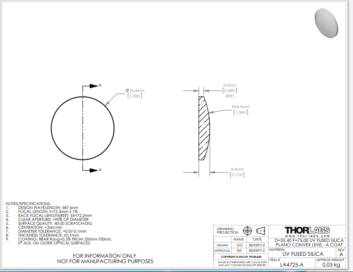 Thorlabs索雷博 LA4725-A 平凸透镜